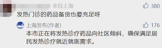 另外,针对药品储备的问题,上海发布表示:正在将发热诊疗药品向社区倾斜,确保满足居民发热诊疗就近就医需求。