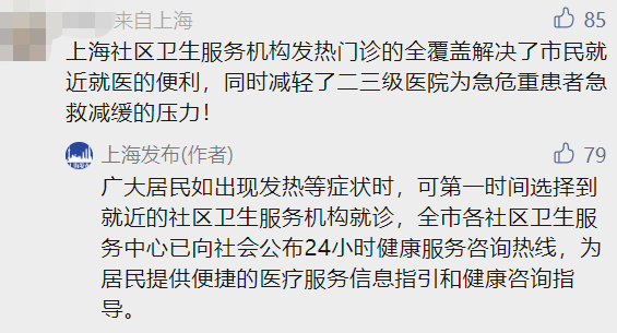 同时,上海发布进一步表示:广大居民如出现发热等症状时,可第一时间选择到就近的社区卫生服务机构就诊,全市各社区卫生服务中心已向社会公布24小时健康服务咨询热线,为居民提供便捷的医疗服务信息指引和健康咨询指导。(详情)社区卫生服务中心已充实医务力量,安排有经验的医务人员接诊发热患者,并全部与上级医院建立紧密对接。