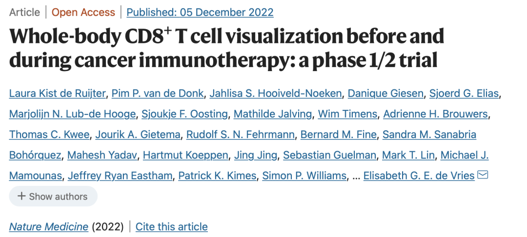近期,来自荷兰University of Groningen的Elisabeth G. E. de Vries研究组在Nature Medicine上发表题为Whole-body CD8+T cell visualization before and during cancer immunotherapy: a phase 1/2 trial的文章,通过设计制备靶向CD8a的指示抗体,展示了肿瘤免疫治疗1/2的临床数据,以及CD8+T的动态分布特征。