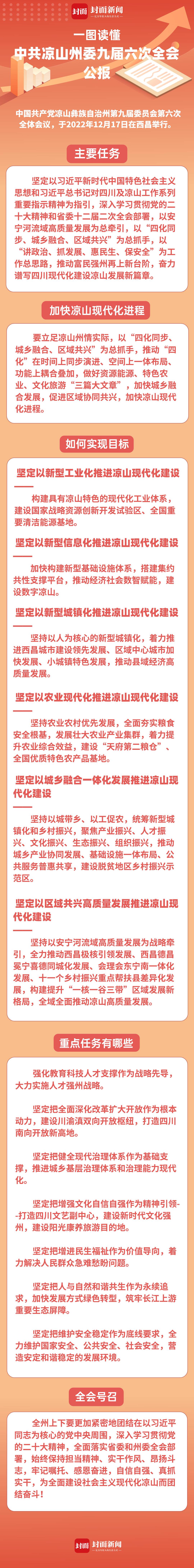 12月17日,中国共产党凉山彝族自治州第九届委员会第六次全体会议举行。全会听取和讨论了凉山州委书记段毅君代表州委常委会作的工作报告,和题为《全面融入全国全省大局全力推进凉山现代化建设在新征程上奋力谱写凉山发展新篇章》的主题报告,审议通过了《中共凉山州委关于深入学习贯彻党的二十大精神奋力谱写新时代四川现代化建设凉山新篇章的决定》。