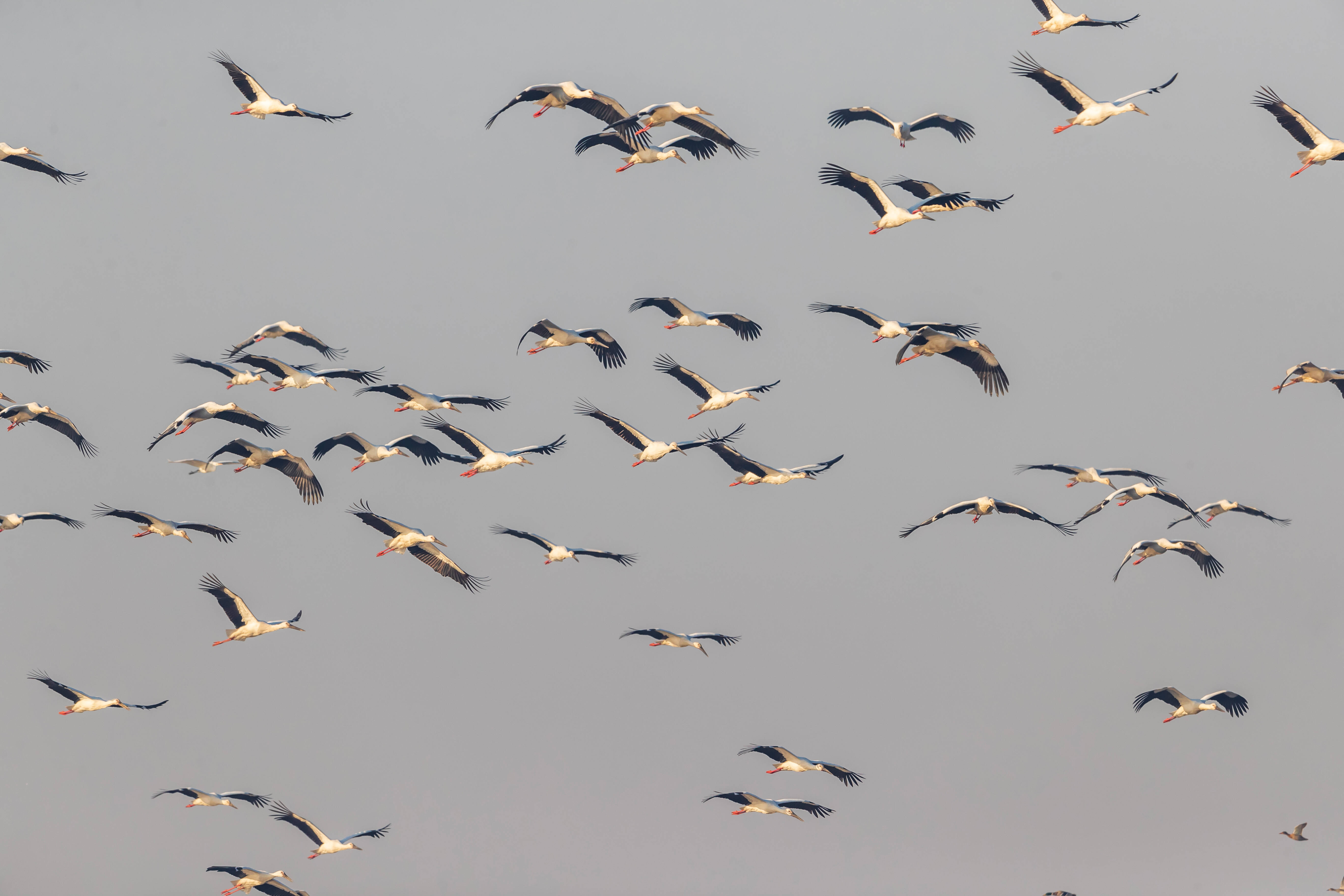12月19日,一群东方白鹳在沂河山东省临沂市郯城县马头段上空飞舞。