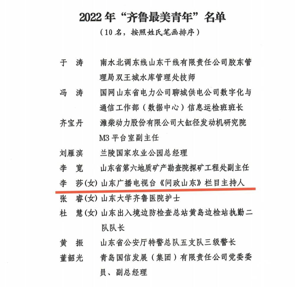 自2010年进入山东广播电视台工作以来,李莎始终脚踏实地、追求卓越。特别是2019年3月担任《问政山东》栏目主持人和督办员以来,担当作为、真问敢问,有力推动省委、省政府重点工作落实,促进解决了一系列改革发展难题和群众“急难愁盼”问题,同时热心公益,服务群众,成为广大青年学习的榜样。