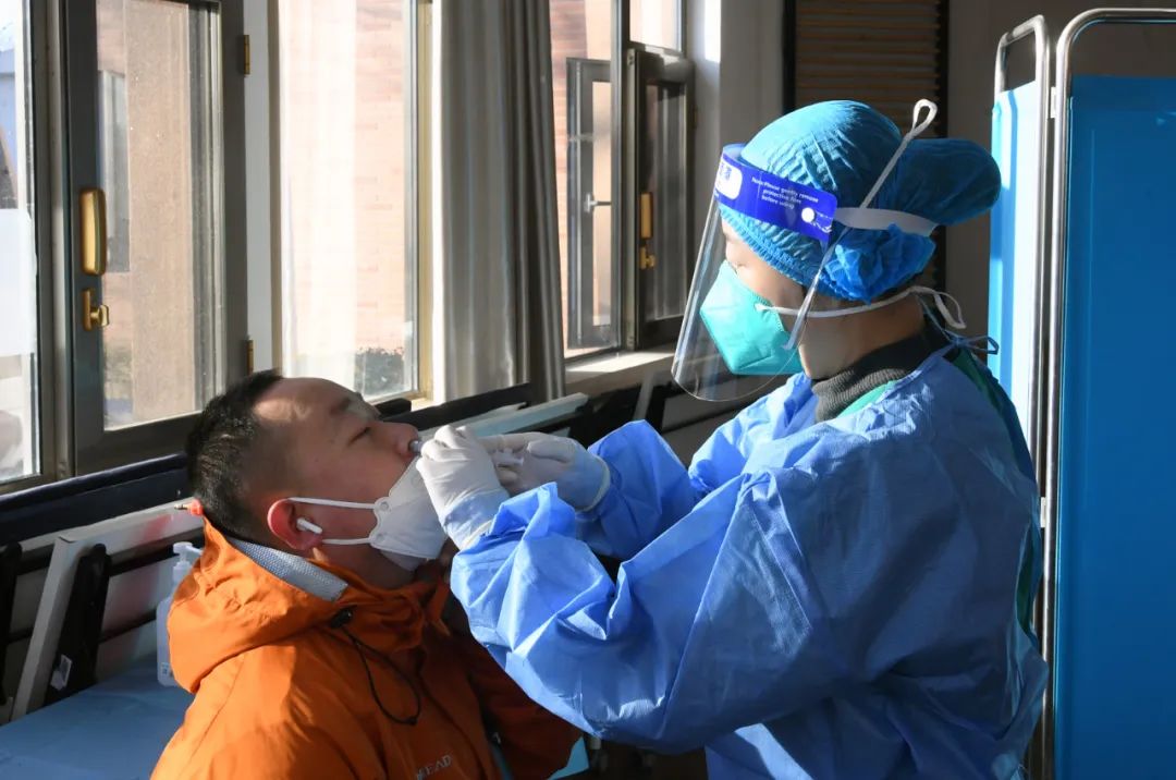 12月17日,在北京市海淀区田村路街道新冠疫苗临时接种点,医护人员为市民接种鼻喷第二剂次加强针。新华社记者 任超 摄