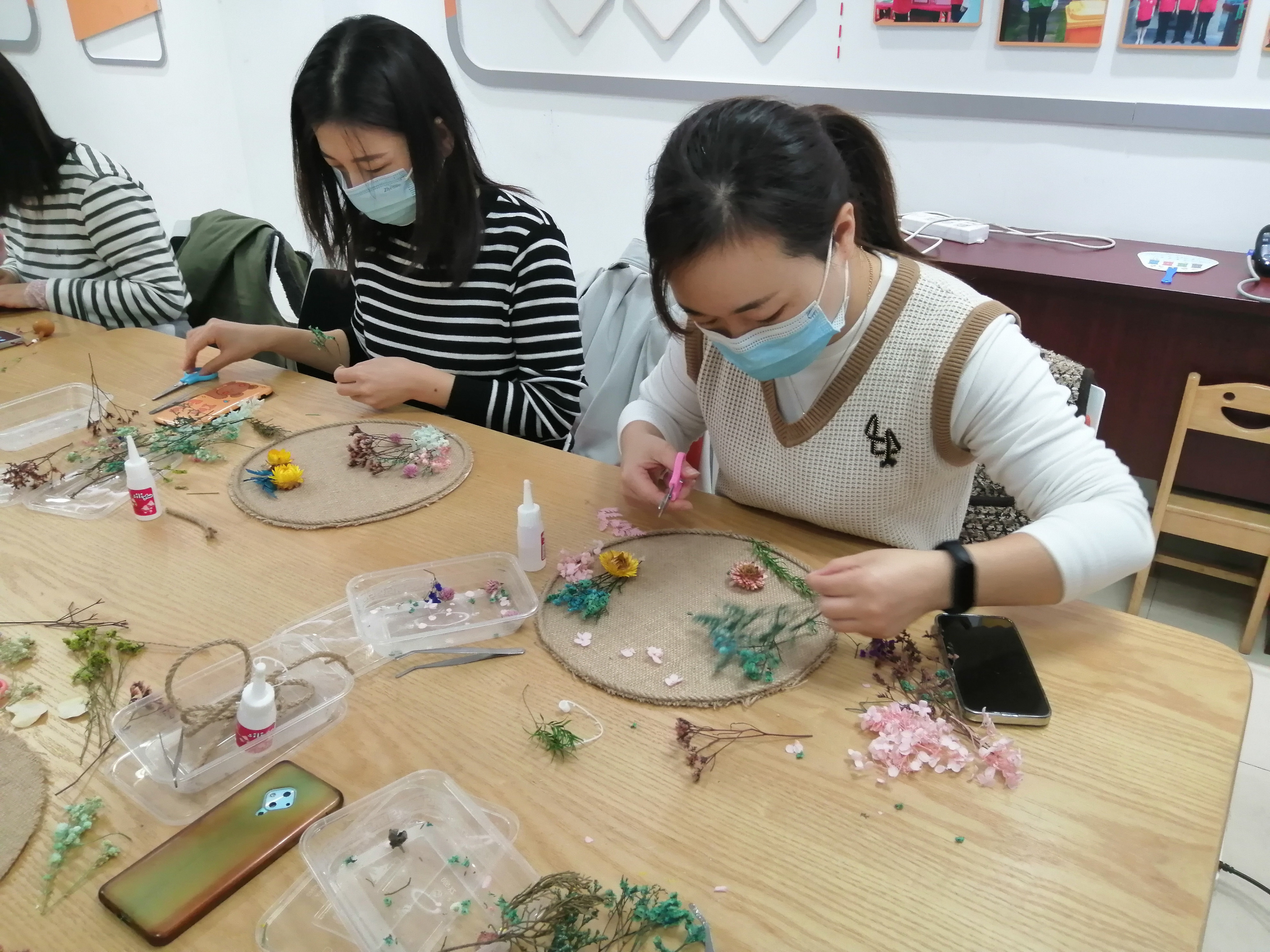 在花艺老师的专业指导下,大家齐动手,忙得不亦乐乎,将爱与创意融入手作,各式各样的花花草草,通过剪接、绑枝、粘贴的方式组合在一起,被制成了一件件精美的永生花装饰品。