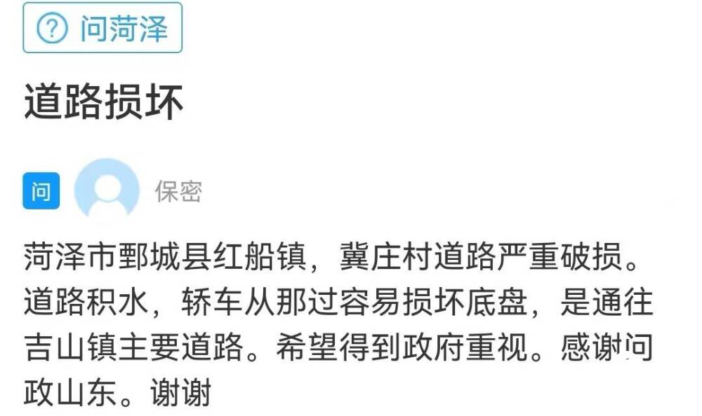 齐鲁网·闪电新闻12月20日讯 菏泽的一位网友在《问政山东》网络问政平台留言说:鄄城县红船镇冀庄村道路是通往吉山镇的主要道路,严重破损,下雨的时候路面会有积水,希望得到政府重视。