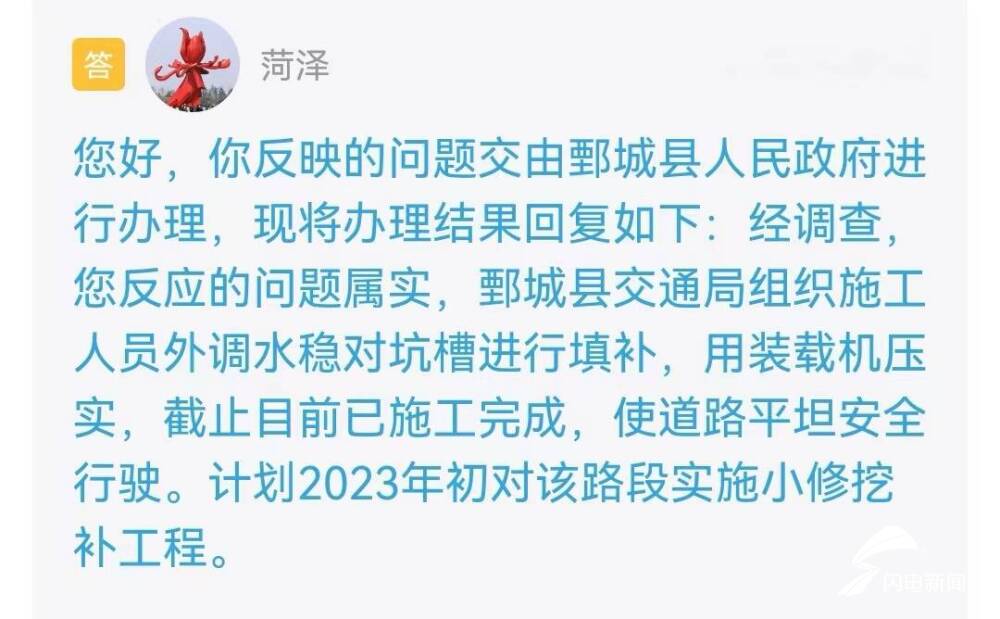 菏泽市收到问题后,进行了办理并回复说:鄄城县交通局组织施工人员外调水稳对坑槽进行填补,目前已施工完毕。计划2023年初对该路段实施小修挖补工程。
