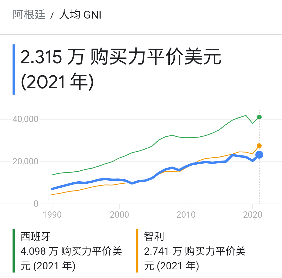 阿根廷的人均收入并不低。这些年虽然经济大衰退,人均收入依然和中国持平。即便考虑到物价飞涨,购买力也没有低到太离谱。