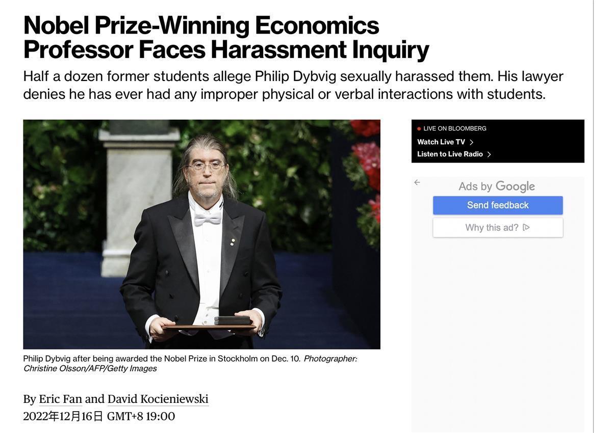 今年诺贝尔经济学奖得主菲利普·戴布维格因涉嫌性骚扰,正在接受圣路易斯华盛顿大学的调查,其律师声称这些指控“实际上是不准确的”,这是“职业竞争”导致的后果。(极目新闻12月18日报道)据彭博新闻社报道,曾就读于圣路易斯华盛顿大学奥林商学院的中国留学生Karen Xiang称,她曾被戴布维格拉到腿上合影,还被他摸手。中国女留学生还给戴布维格起了个外号叫“摸小手”。