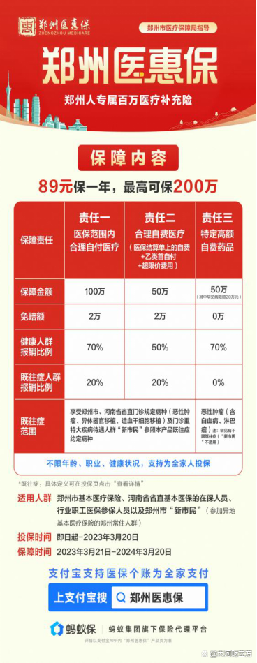 郑州基本医保参保人及“新市民”均可通过上支付宝App搜“郑州医惠保”在蚂蚁保保险频道一键投保,支持医保个人账户余额预约缴费。