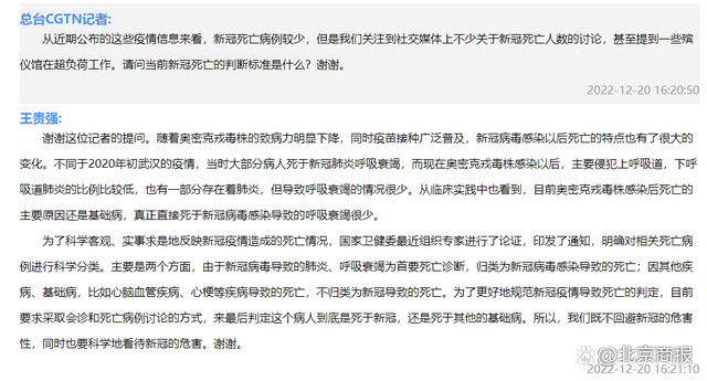 12月20日15时,国务院联防联控机制召开新闻发布会,介绍重点人群医疗服务有关情况。会上有媒体提问,从近期公布的这些疫情信息来看,新冠死亡病例较少,但是我们关注到社交媒体上不少关于新冠死亡人数的讨论,甚至提到一些殡仪馆在超负荷工作。请问当前新冠死亡的判断标准是什么?
