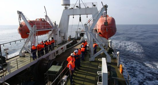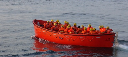 救助艇下水,10名船员全部集合,登上了6人容量的救助艇。一名船员没有穿救生衣就弃船了。