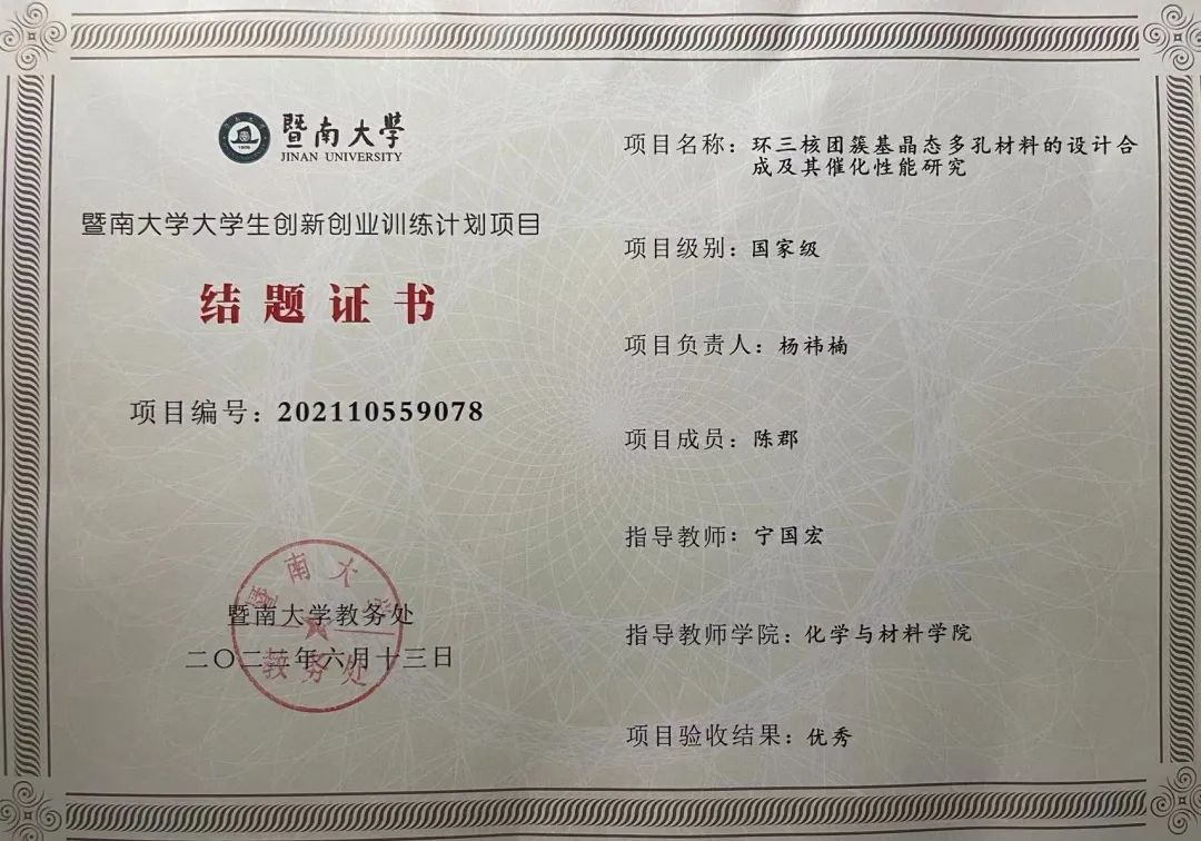 高中时期,他就对化学十分感兴趣,并顺利拿下浙江省高中化学奥林匹克竞赛预赛一等奖。高考后,他如愿进入暨南大学化学与材料学院应用化学专业学习,他的“化学梦”终于有了一片安放的小天地。