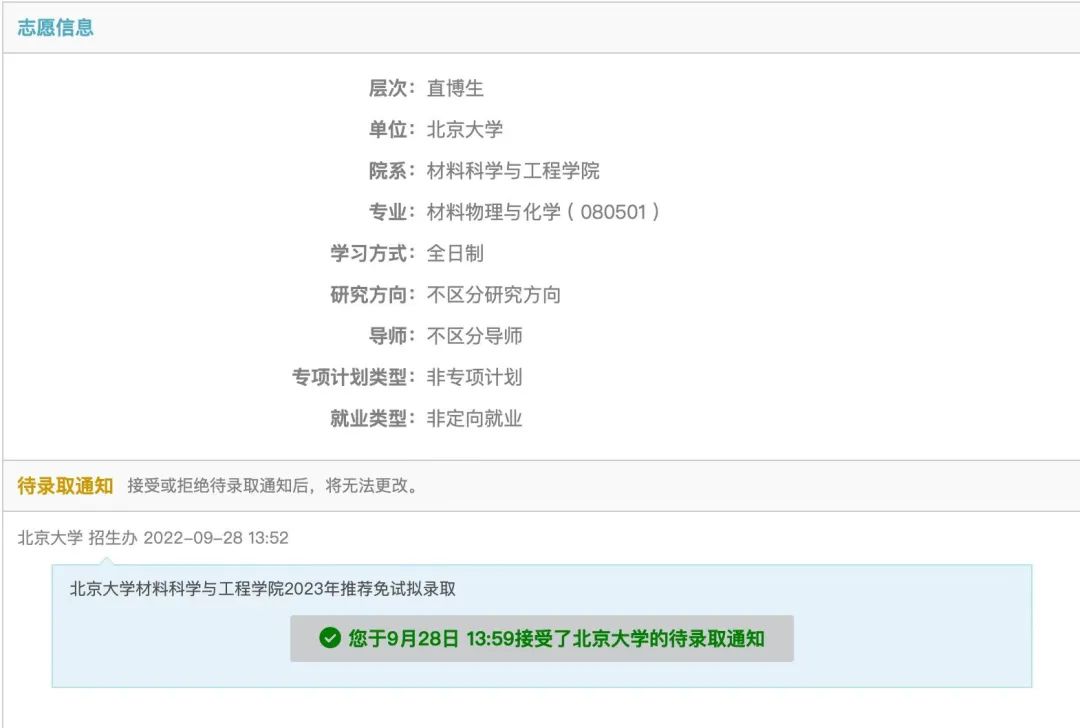 最终,杨祎楠获得北京大学、清华大学、复旦大学和上海交通大学等5所名校的offer,其中3所都提供了直博的名额,反复权衡之下,杨祎楠选择了北京大学材料科学与工程学院。