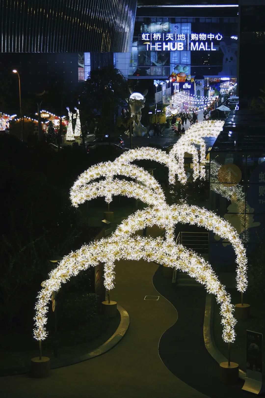 夜色降临,虹桥天地演艺广场上,灯光装饰起16个小木屋,6座“大天使”隔道相望,对着天空吹起一首浪漫颂歌,用细腻的灯光点亮整片夜空。胡桃夹子、毛线小物、热红酒……环绕着此起彼伏的音乐,构成了这场“光影集市”的巨大吸引力。