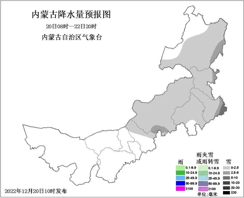 20日08时至22日20时,乌兰察布市北部、锡林郭勒盟、赤峰市中部和北部、通辽市、兴安盟、呼伦贝尔市大部有0.1~2.4毫米的小雪,锡林郭勒盟南部、通辽市东南部、兴安盟东部、呼伦贝尔市东南部有2.5~4.9毫米的中雪,通辽市东南部局部地区有5.0~9.9毫米的大雪(图1)。