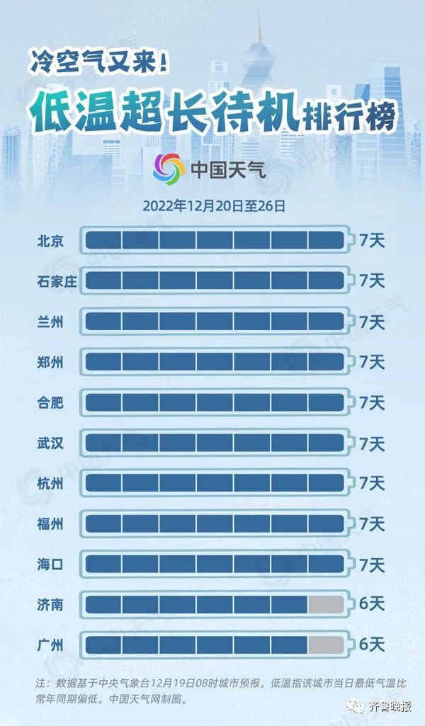 北京、石家庄、兰州、郑州、合肥、武汉、杭州、福州、海口未来七天的最低气温都维持在偏低状态。济南、广州未来六天日最低气温也低于常年平均水平。
