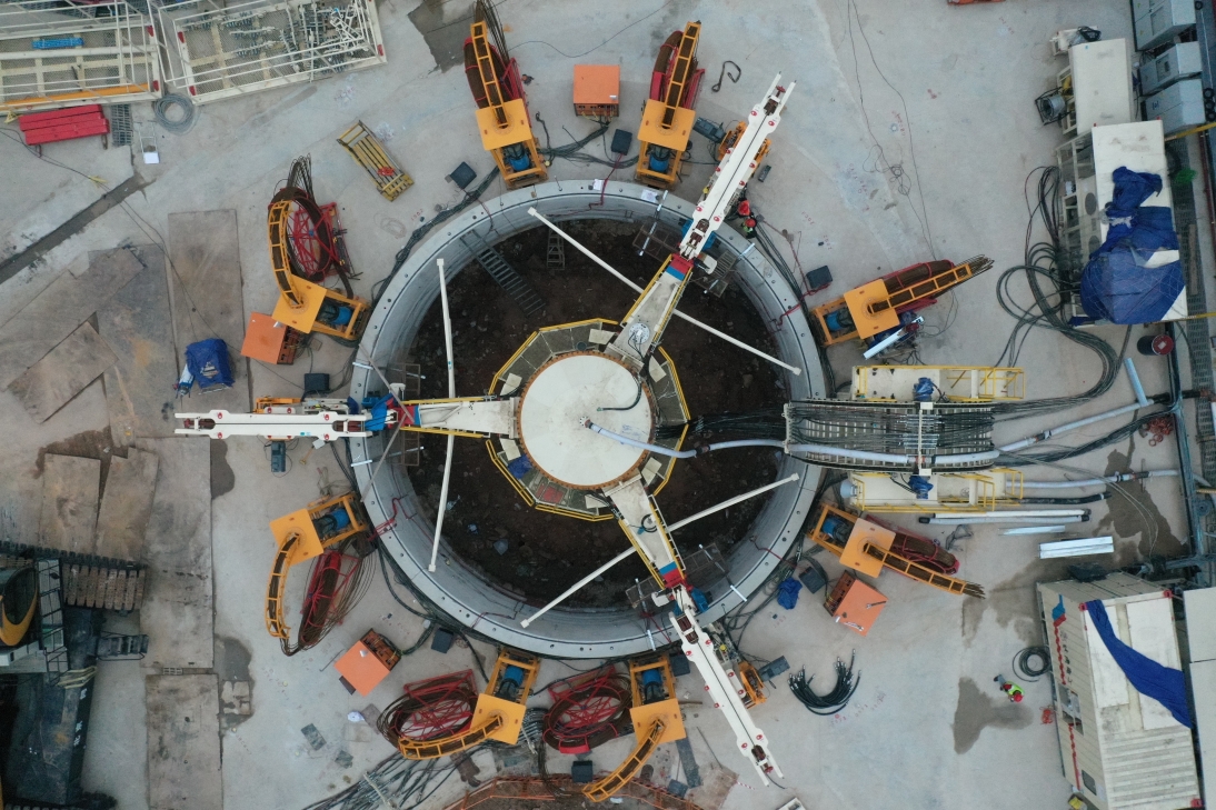 在京白2号井首次投入使用的竖井掘进机,开挖直径达14.2米,重约120吨,采用截削式刀头和环形刀盘两种开挖模式,并集合了泥浆环流出渣系统、中心高压冲刷系统、掘进参数在线实时监测系统等先进技术,能有效确保施工安全、质量及效率。针对京白2号井的地质条件,本次竖井掘进机掘进至27米后,进行水下混凝土封底,施作底部环梁,在下部微风化岩层采用爆破开挖。