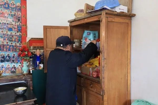 走进高林普家,干净卫生的小院映入眼帘,几间白砖黑瓦的平房围出的四方院子在高林普的打理下井井有条。走进坐北朝南的堂屋,高林普正照顾母亲起床。母亲的床靠近窗户,冬日的暖阳正好能晒在床铺上。高林普介绍,这间全家光线最好的屋子就是母亲的卧室,也是全家的餐厅、会客室。屋子正中间显眼的位置,放着他和父母的合照,以及他荣获河南省首届“孝贤家庭”的光荣牌。母亲的床边是衣柜,电视机旁边的柜子则是专门为母亲设置的“零食柜”。鸡蛋、奶粉、藕粉、各式小面包蛋糕、苹果等把这个上下两层的柜子填得满满当当。高林普介绍,这些都是母亲爱吃的东西,专门给她放在这个柜子里。