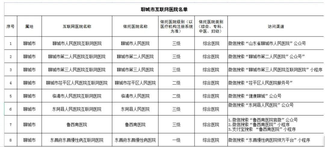 记者从聊城市卫生健康委获悉,为充分发挥互联网诊疗服务优势,聊城市开设8家互联网医院,为发热患者、慢性病患者提供线上诊疗、用药指导、预约挂号、心理咨询等服务,名单如下: