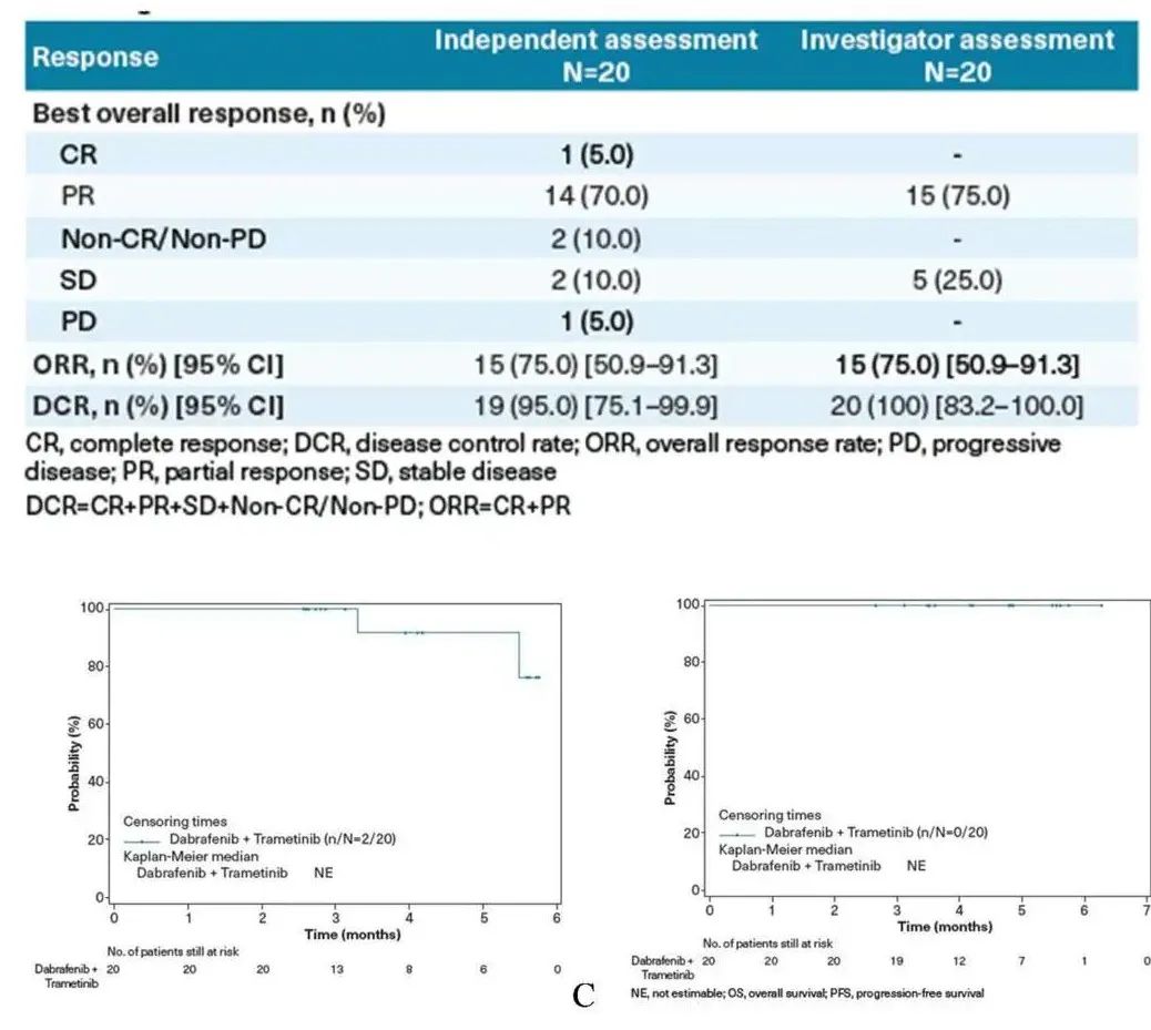 达拉非尼联合曲美替尼治疗中国BRAF V600突变NSCLC显示出良好的抗肿瘤活性和安全性,疗效及安全性数据均优于全球注册研究结果,填补了亚洲人群BRAF突变NSCLC的数据空白。目前随访时间较短尚无PFS及OS数据,期待更长时间的随访结果,造福更多中国BRAF V600E突变患者。
