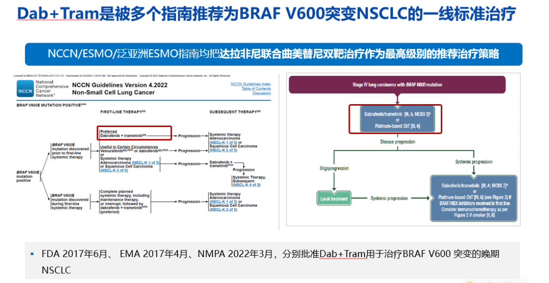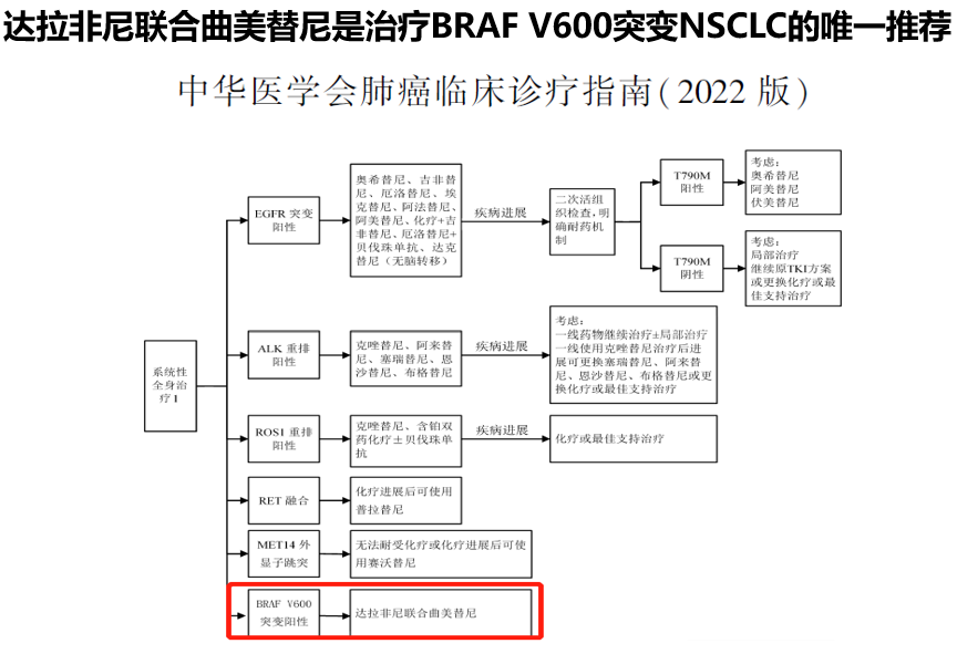 Dab+Tram中国注册临床研究结果显示[1],截至2021年3月11日,该研究中位随访时间为5个月,共入组了20例初治和经治的BRAF V600E突变NSCLC中国患者。全线治疗ORR高达75%,高于既往全球注册研究数据(1L ORR 64%),提示Dab+Tram治疗方案在中国人群中可能具有更优的获益趋势。由于随访时间较短,中位DOR、PFS、OS尚未达到。中国人群与全球人群安全性一致,未观察到新的安全性风险。最常见的不良反应为发热、贫血、AST升高、低蛋白血症、中性粒细胞和白细胞计数减少,其中发热的整体发生率45%。中国人群发热的发生率低于全球注册研究发生率(1L 64%,≥2L 46%),Dab+Tram双靶治疗疗效优异,安全性可控。2022年3月,国家药品监督管理局(NMPA)基于中国注册研究优异的疗效和安全性数据,批准了达拉非尼联合曲美替尼用于治疗BRAF V600E突变阳性转移性非小细胞肺癌,成为中国首个获批的针对BRAF V600E突变NSCLC的双靶向联合治疗药物。NCCN、ESMO及CSCO指南[4,11,12]均将达拉非尼联合曲美替尼双靶治疗作为BRAF V600E突变NSCLC患者的一线治疗推荐方案。最新版《中华医学会肺癌临床诊疗指南(2022版)》[13]也已将达拉非尼联合曲美替尼作为BRAF V600E突变晚期NSCLC的唯一推荐。