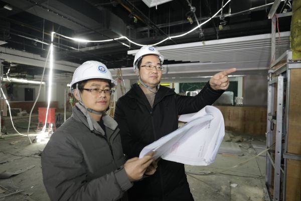 张鹏(图右一)带领团队推进武创院本部大楼装修建设。