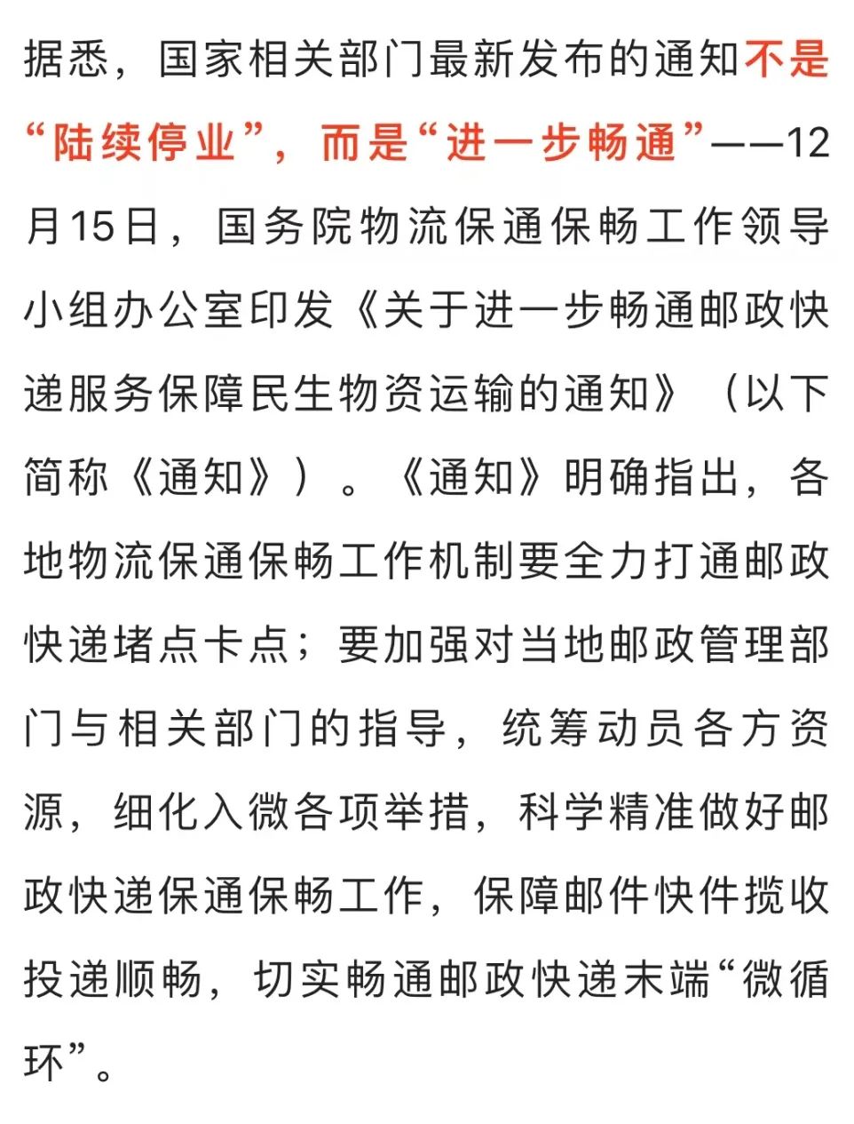 一位快递业人士分析,这种言论应该出自某些电商,“他们以年底快递停运为由,诱导消费者下单购物。几乎每一年,都会出现类似的套路。”在网传信息中,就有类似的暗示,如“请大家提前备货”“请各位亲们早做准备”。
