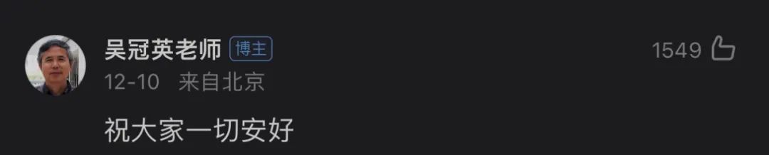 12月9日,吴冠英还更新了一条微博,分享了他在门上贴的一张小画。画面中有一只小兔子,配有“快递请放门口,小件请放纸盒里,谢谢!”12月10日,他还在评论区留言:“祝大家一切安好。”