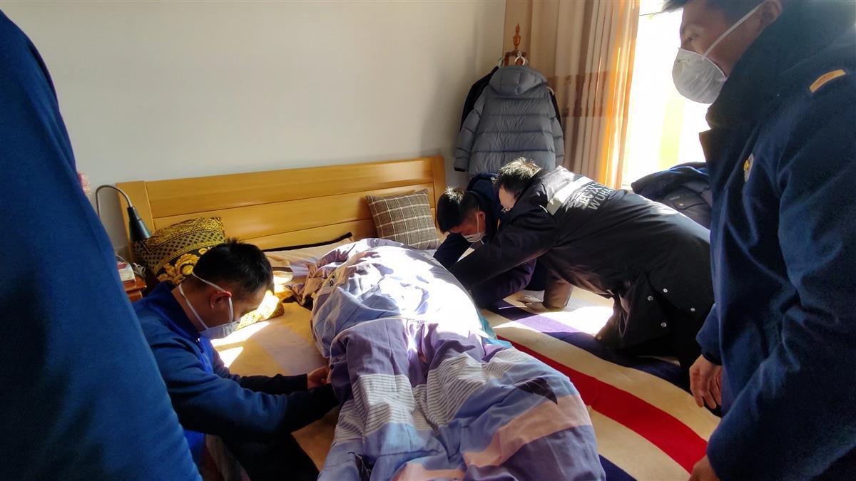 了解情况后,消防员立即携带担架、安全绳等装备,前往六楼房间内进行救援。在家属的协助下,消防员将担架放在床上,小心翼翼把孕妇连同被子一起抬到担架上,随后在医护人员的指导下,使用安全绳将孕妇固定在担架上,并在固定时不断询问孕妇是否不适。