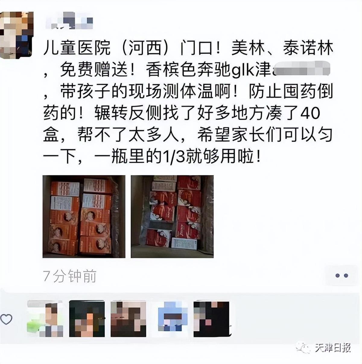 就像媒体报道的,该市北辰铁东路附近一商家派发成人退烧药,每人十粒,免费领取;北辰双街一车主免费派发儿童退烧药;有人在网上求药,2000多人回应,“东丽有一瓶,发位置给我,我给您送去。”