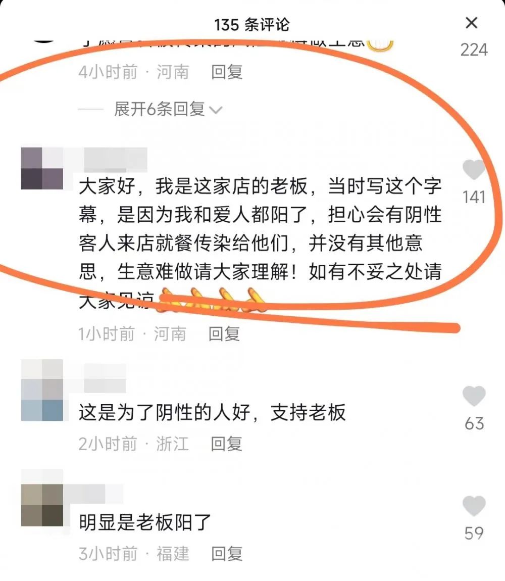 对于老板娘的解释,大部分网友纷纷表示理解和支持:“这是为了阴性的人好,支持老板”“明显是老板阳了”……