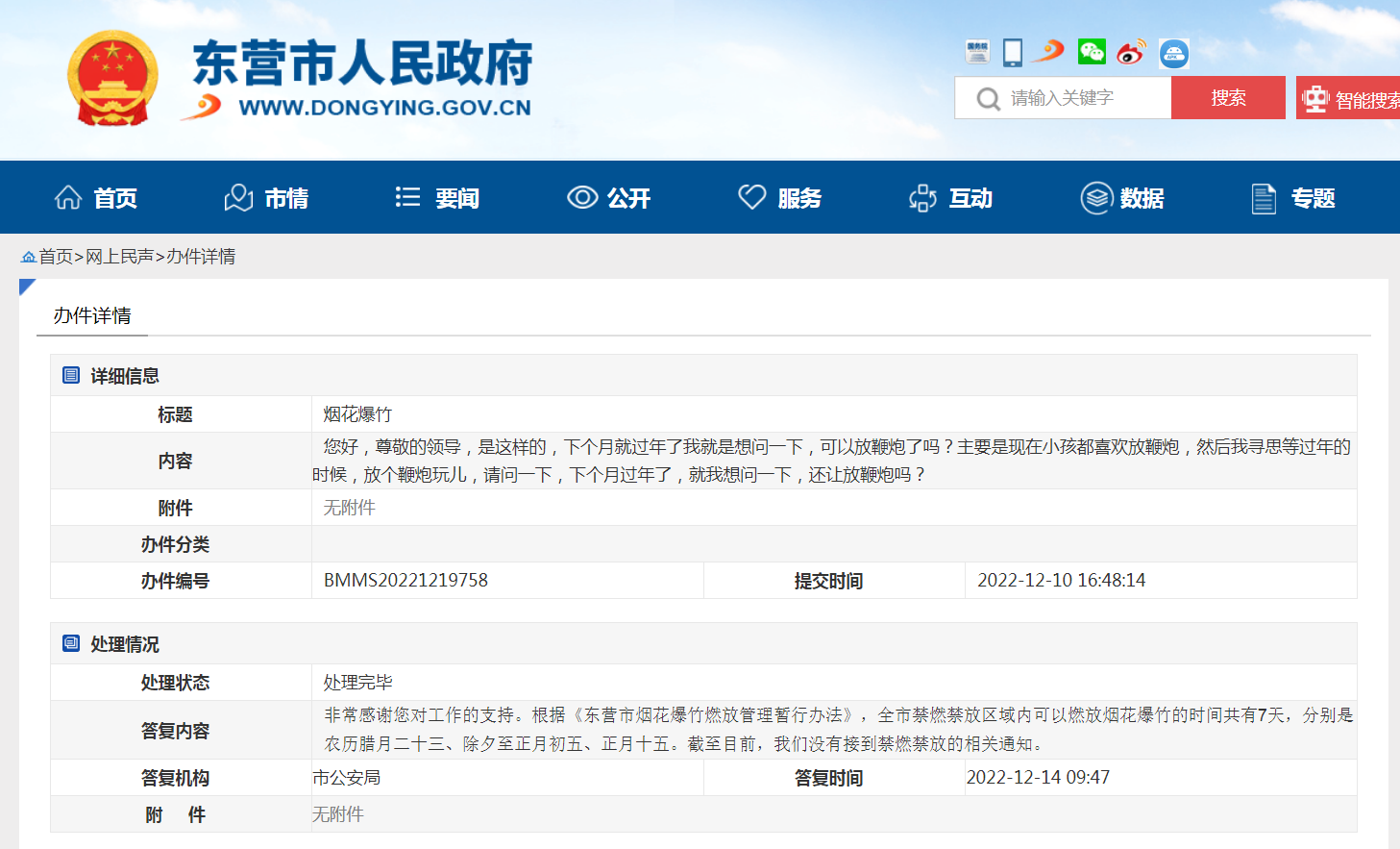在东营市政府官网,有市民于12月10日提问称,下个月就过年了,可以放鞭炮吗?
