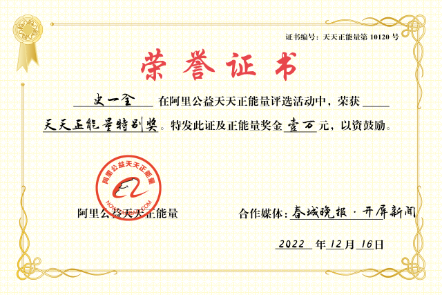阿里公益天天正能量联合春城晚报—开屏新闻、红塔区融媒体中心,为史一全颁发天天正能量特别奖及10000元奖励,为大爱之举助力!