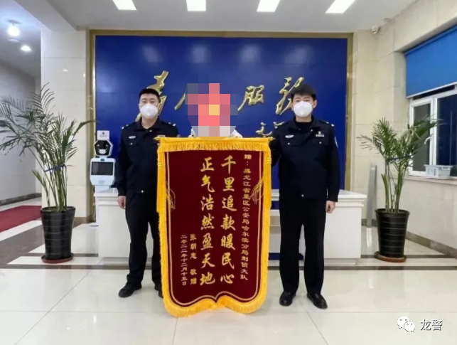 近日,垦区公安局哈尔滨分局辖区居民张某专程从岔林河农场来到垦区公安局哈尔滨分局刑侦大队,将一面印有“正气浩然盈天地 千里追款暖民心”的锦旗送到办案民警手中,“太感谢警察同志了,帮我挽回了1万多块呢,真是太谢谢了”。