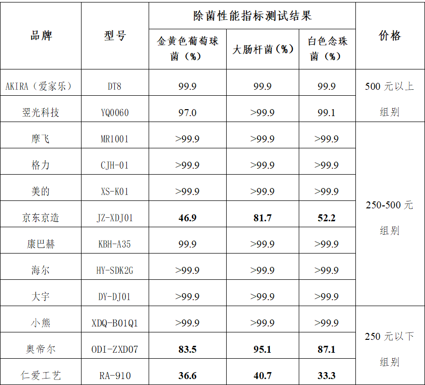 仁爱工艺品牌样品的除菌效果表现最差,3种微生物的除菌率均低于50%。