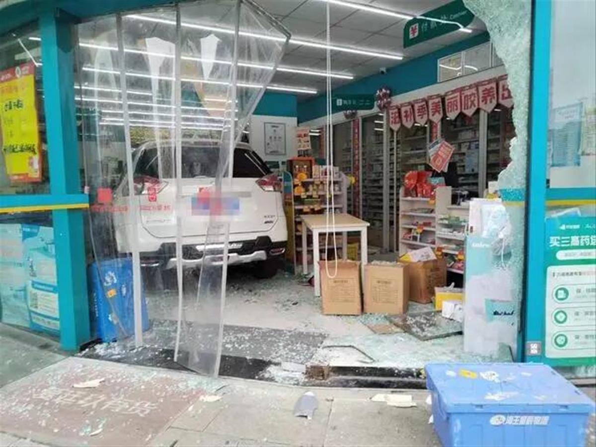 事发地点附近一家商铺的工作人员称,事发上午9时30分许,她突然听到附近传来一声很大的声音,随后听到有人说出了车祸,她出门发现是一辆白色越野车开进了一家药店内,药店玻璃门全部碎了。