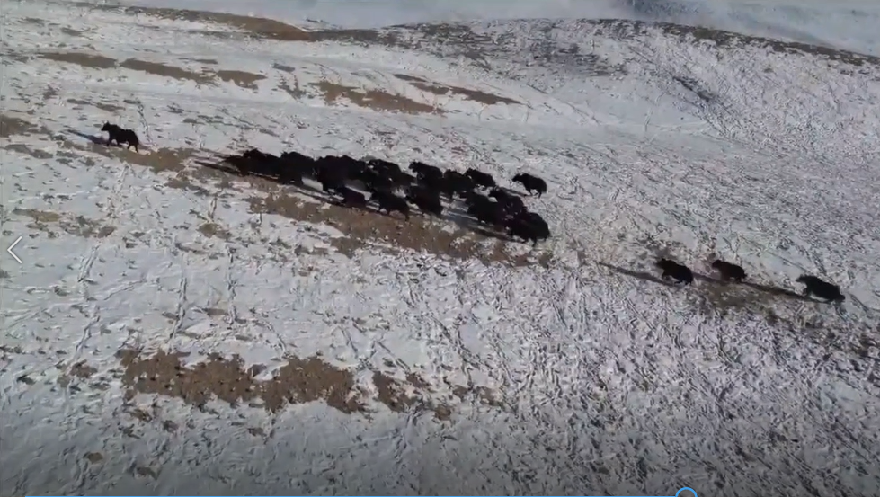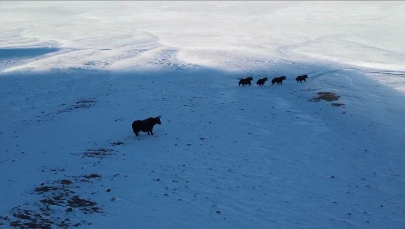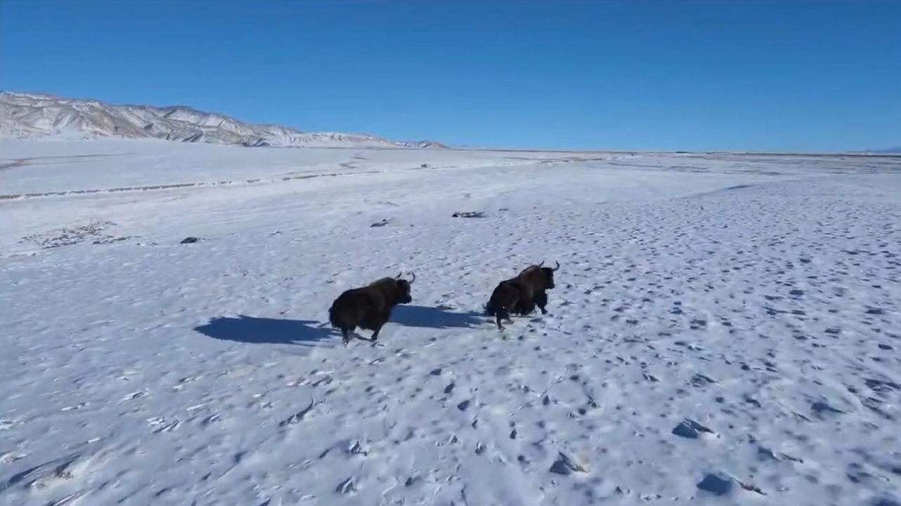 近日,在祁连山国家公园阿克塞境内的哈尔腾草原上,出现国家一级保护动物野牦牛群,大群野牦牛在雪地奔跑,画面壮观,在这一地区实属罕见。