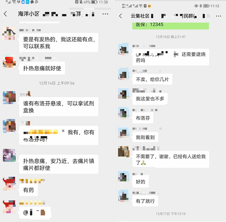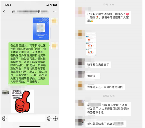 红塔社区中环星座微信群里,居民自发帮助没药的居民想办法,住在1单元7楼的大姐一句“你在哪?我给你拿药”,2单元8楼的居民说“你是发烧了吗,我给你两粒布洛芬,可以救个急”,“大家不用帮我找了,已经有好心的邻居主动给我了,感谢这个大家庭!”楼上居民在网格群里发信息说急需抗原,楼下邻居立刻拿出家中备用进行分享;有居民问小区附近哪有扑热息痛可以购买,看到消息的邻居马上回复“东北大药房七纬路店”,还有在医院工作的居民在群里分享着退烧小妙招,十一纬路81号居民家孩子发烧,买不到退烧药美林,在群中求助,多位邻居愿意无偿对其提供帮助,微信群中也经常看到有居民在药房买到扑热息痛,立刻在群里发定位分享消息,让大家可以第一时间买到退烧药……不仅如此,社区网格员还将防疫常识等科普知识在微信矩阵中发布,将24小时家庭医生联系方式告知居民,多种方式为居民提供用药指导,化解居民的紧张情绪。