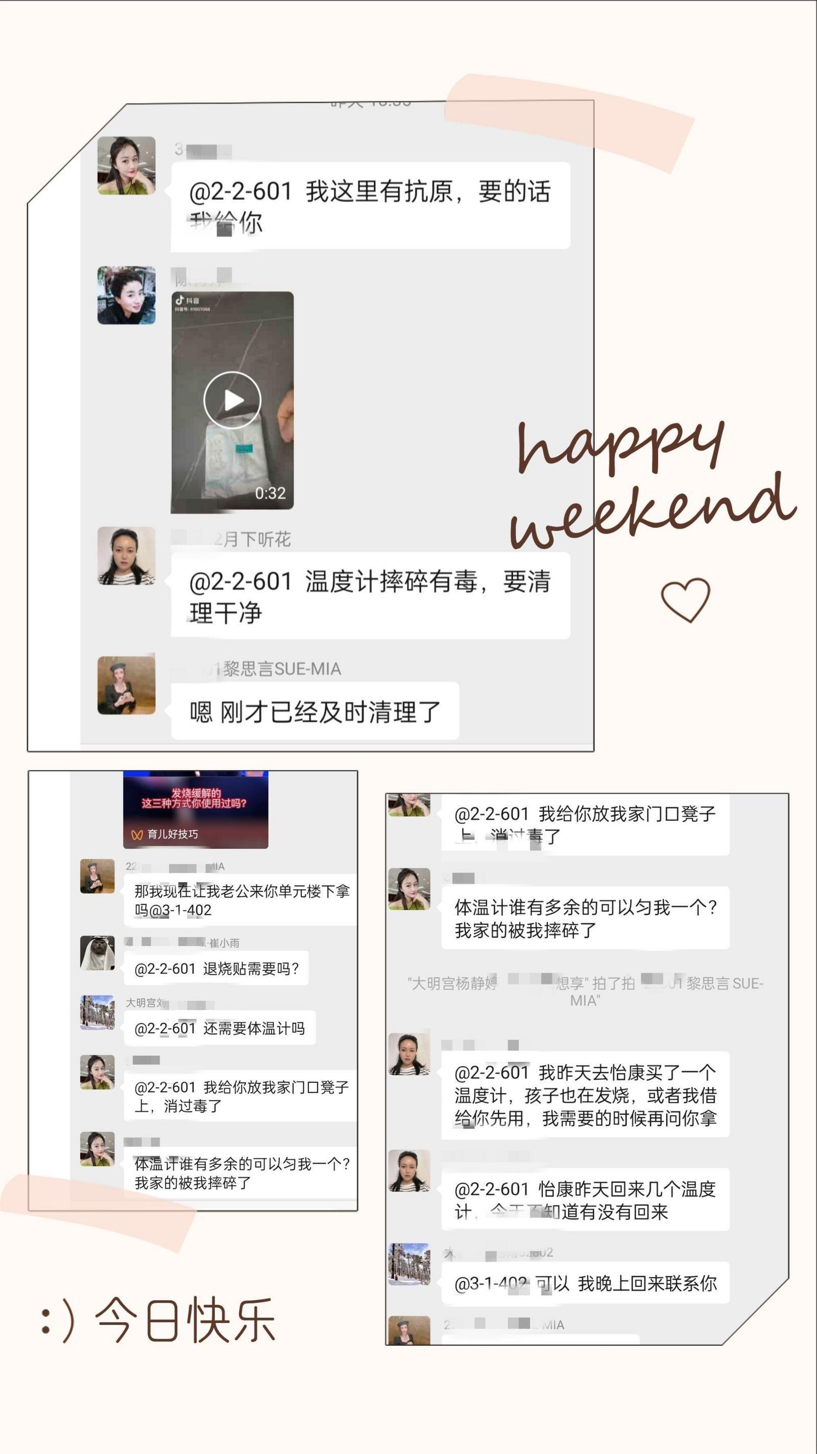“我有,已经消毒过了”“我这里还有多余的抗原,要吗”“温度计里的水银有毒,要及时清理”……面对有困难的邻居,大家纷纷快速回应,互帮互助,援助体温计、抗原检测试剂、退烧贴,分享降温小妙招。字字句句透着暖,行行话语都是情。有的居民还主动发信息,表示家中有退烧药品,急需的邻居可以在群内说一声,他迅速送到楼下;还有的居民缺少抗原试剂盒,提出想花钱购买,好邻居直接群内回复“免费送”。困难得到解决,大家又自主相约,以“无接触”方式尽快送、取到彼此手中。“远亲不如近邻。社区就像一根线,把大家串联在一起,这也让我们面对困难时不再是一个人。在这个寒冬,没什么比这些暖心的举动更窝心的了。”黎女士说。
