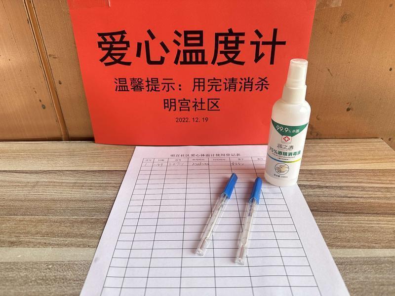 同时,为了方便更多特殊人群,明宫社区立即发动志愿者、爱心人士,在12月19日一大早将筹集到的6支体温计送到辖区各小区门口和拆迁区域居民家中,确保有需要的居民能尽快用上。