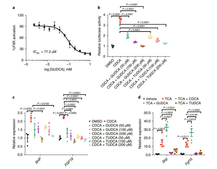 在北京大学基础医学院生理与病理生理教研室与美国国家卫生研究院代谢实验室等多家机构共同发表的《Gut microbiota and intestinal FXR mediate the clinical benefits of metformin》中的研究结果显示:胆汁酸中胆酸(CA)和鹅去氧胆酸(CDCA)是FXR的激动剂,而甘氨熊去氧胆酸(GUDCA)和牛磺熊去氧胆酸(TUDCA)是FXR拮抗剂,GUDCA和TUDCA均显著抑制CDCA诱导的FXR转录活性。