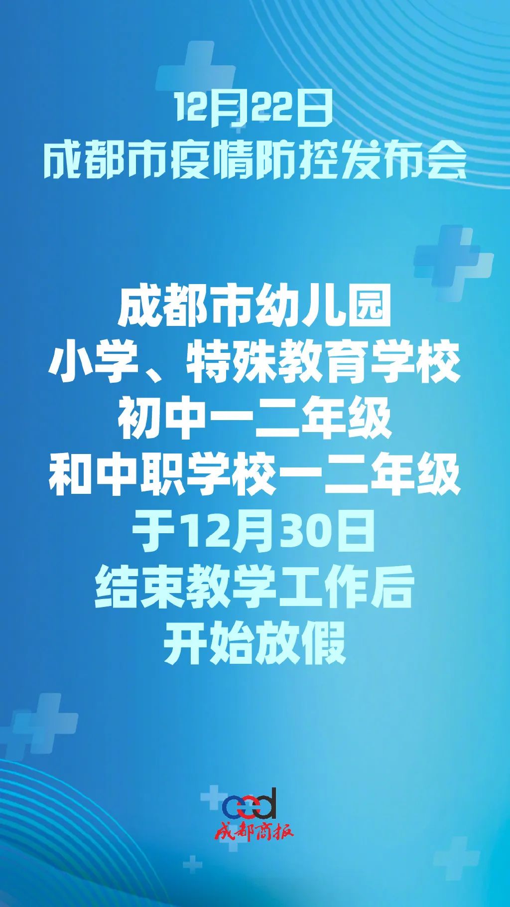 成都市委教育工委委员、成都市人民政府总督学石斌表示:高中一二年级于2023年1月8日结束教学工作后开始放假,高三、初三年级按原计划开展教学。2023年1月16日开始放假,2023年春季学期开学时间按原计划不变,即2023年2月13日办理入学手续,2月14日正式行课。