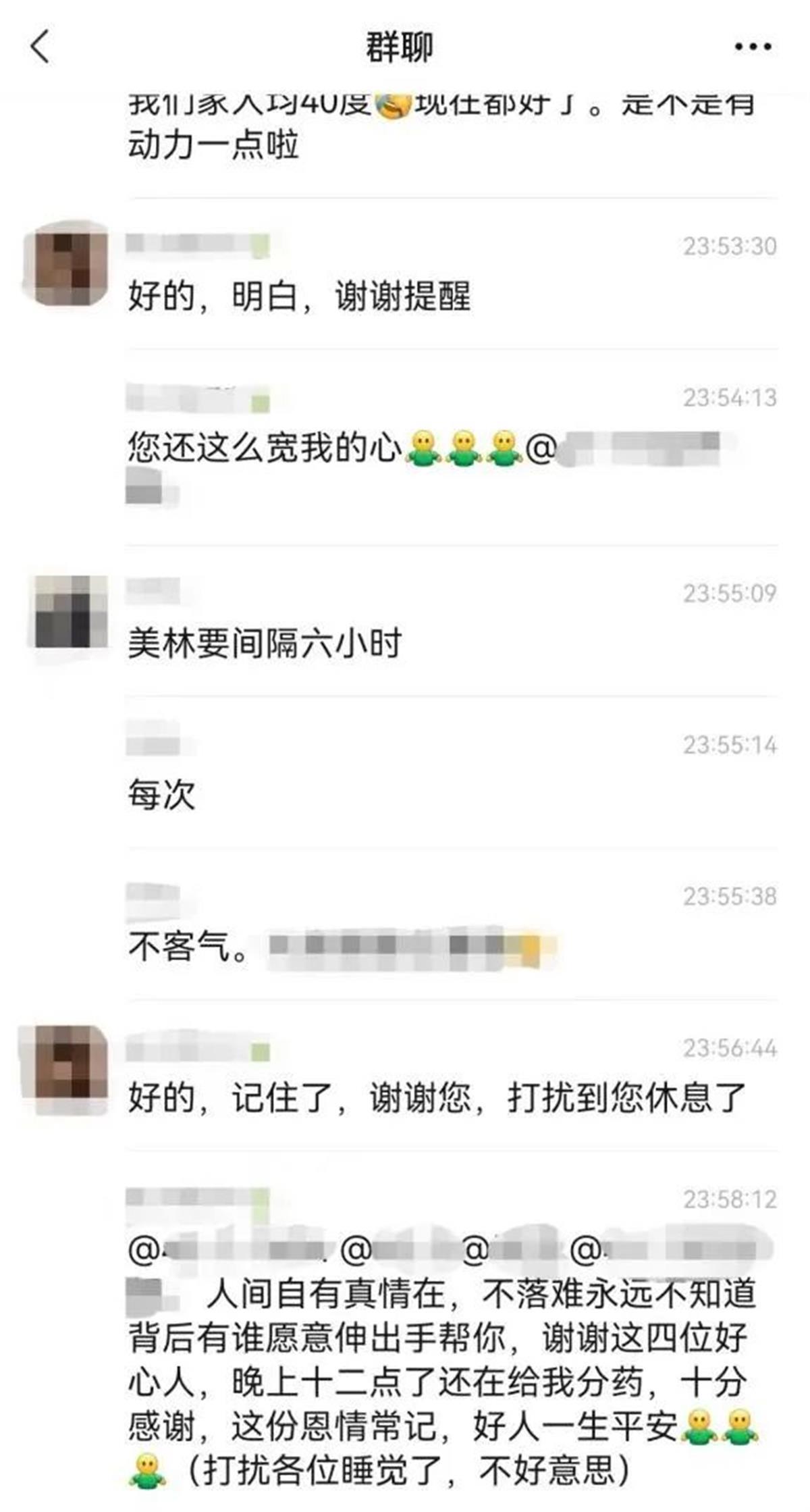 除了共享药品外,大家还经常在群内分享购买物资的途径,告知核酸检测的信息。部分居民们还在群内分享自己的症状和感受,提供用药建议,缓减大家紧张焦虑的情绪,鼓励大家互帮互助,共同度过这段日子。