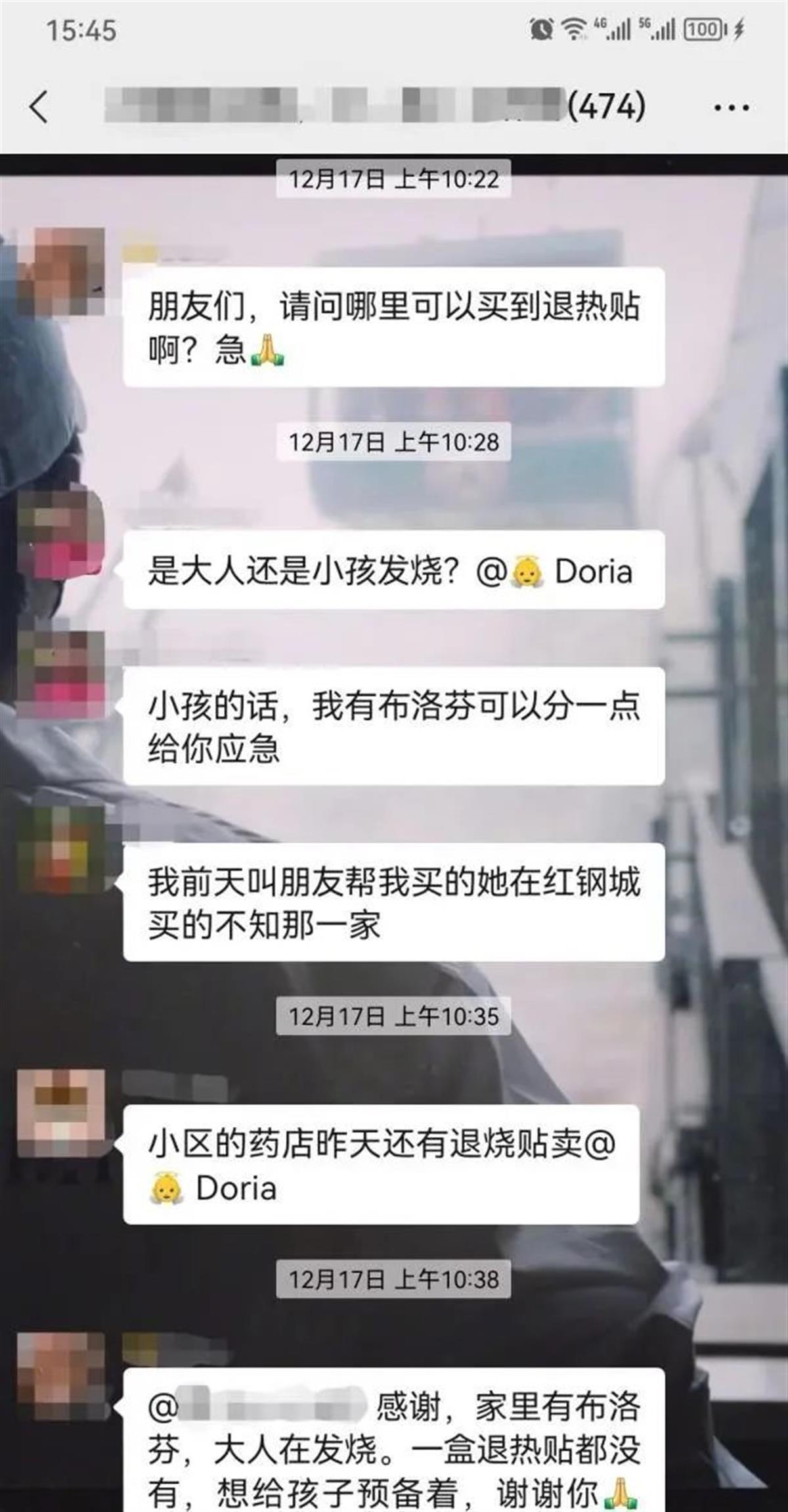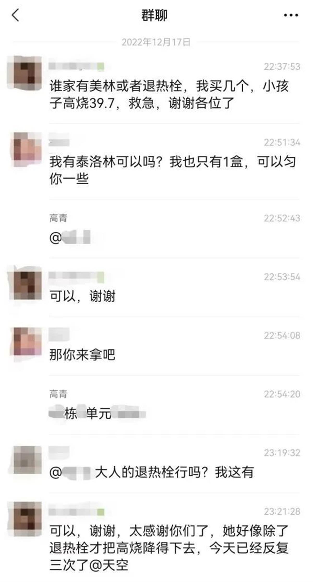 “请问邻居们谁有多的退烧药呀,救急!”“我给你一板,现在可以来拿。”“请问谁家有抗原检测试剂可以转让几个吗?”“我就一个人,一盒也用不完,可以给你匀两个。”“谢谢,我给你带几个梨子过来,你可以煮水喝。”