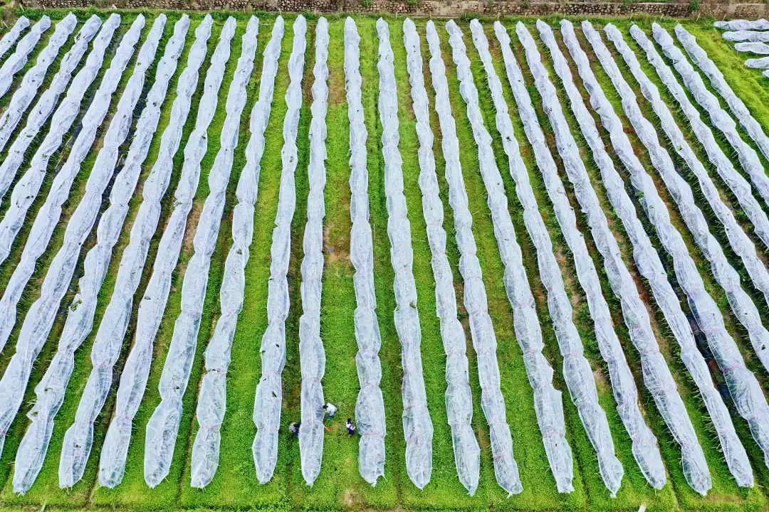 冬至时节,广西梧州岑溪市糯垌镇地麻村农民在给火龙果覆盖薄膜“穿衣”御寒保果保丰收。颜桂海摄