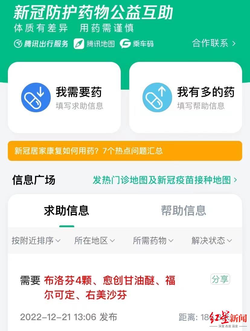 “从上周末开始,我们就看到各地官方微信公众号陆续提出倡导余药共享、民间互助,也看到网上有很多网友发布寻求药物的消息。看到这些网络信息,我们第一时间就在群里讨论如何快速上线一个公众互帮互助的小程序平台。”12月21日,腾讯工作人员在接受红星新闻采访时说,去年河南汛情爆发期间,腾讯出行服务与腾讯地图团队上线了汛情互助平台。他们立刻想到能否复用此前的产品模型进行快速开发,通过产品平台,更高效地对接互助信息,来响应各地方政府余药共享的号召。