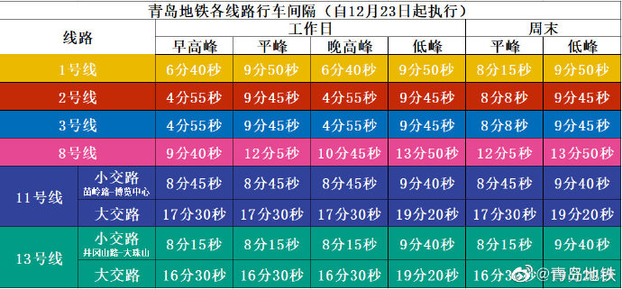 信网12月22日讯 据青岛地铁消息,自12月23日起,青岛地铁行车间隔调整,具体安排如下。