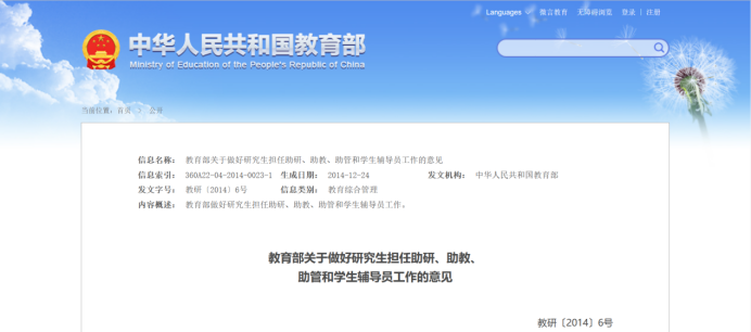 十年后的 2015 年,教育部又发布《关于做好研究生担任助研、助教、助管和学生辅导员工作的意见》,明确对于需要将助教作为必要培养环节的学科和研究生,培养单位应积极创造条件,提供数量充足、符合要求的助教工作岗位。并要求建立开放、公开的聘用制度。助教、助管和学生辅导员原则上应公平、开放、竞争和择优聘任,岗位职责、工作时间、申请要求、选聘标准、选聘程序、岗位津贴、考核方式等信息应统一公开发布。