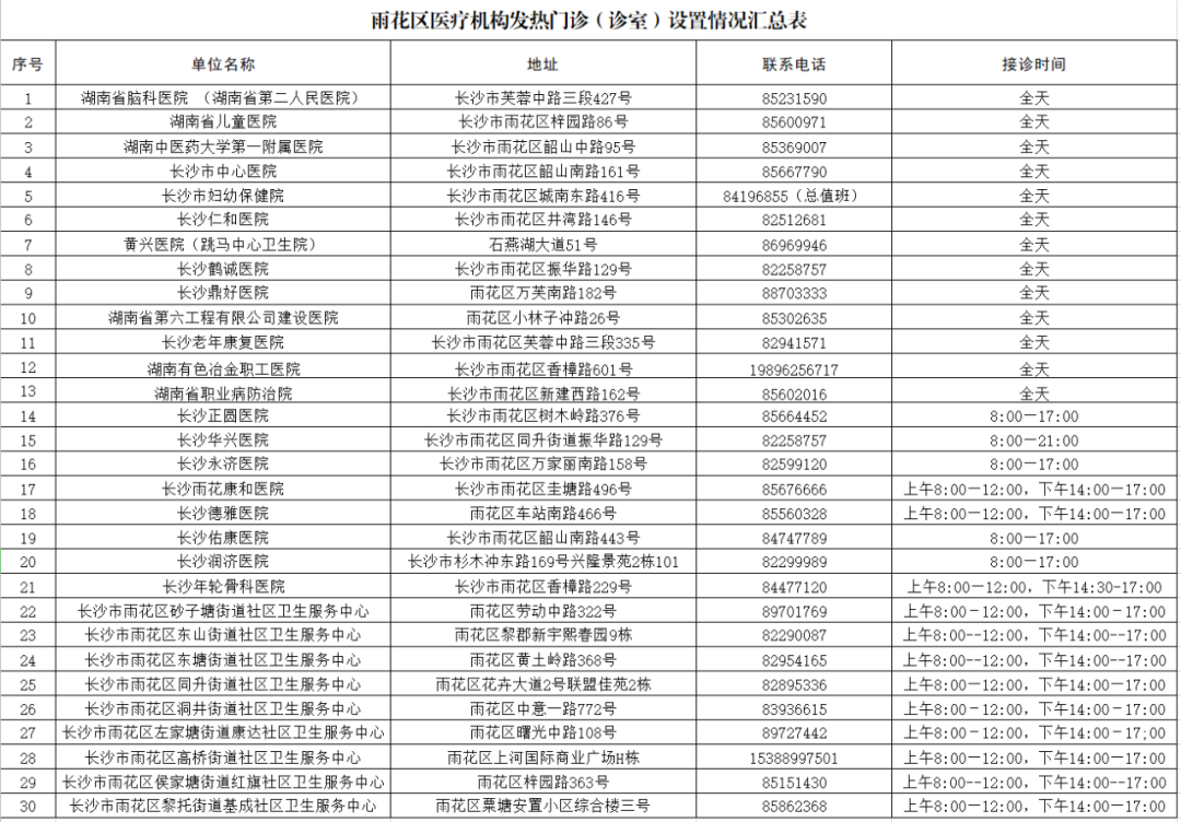 雨花区医疗机构发热门诊(诊室)设置最新情况公示,供大家咨询新冠感染症状、用药治疗等方面的信息,具体名单如下: