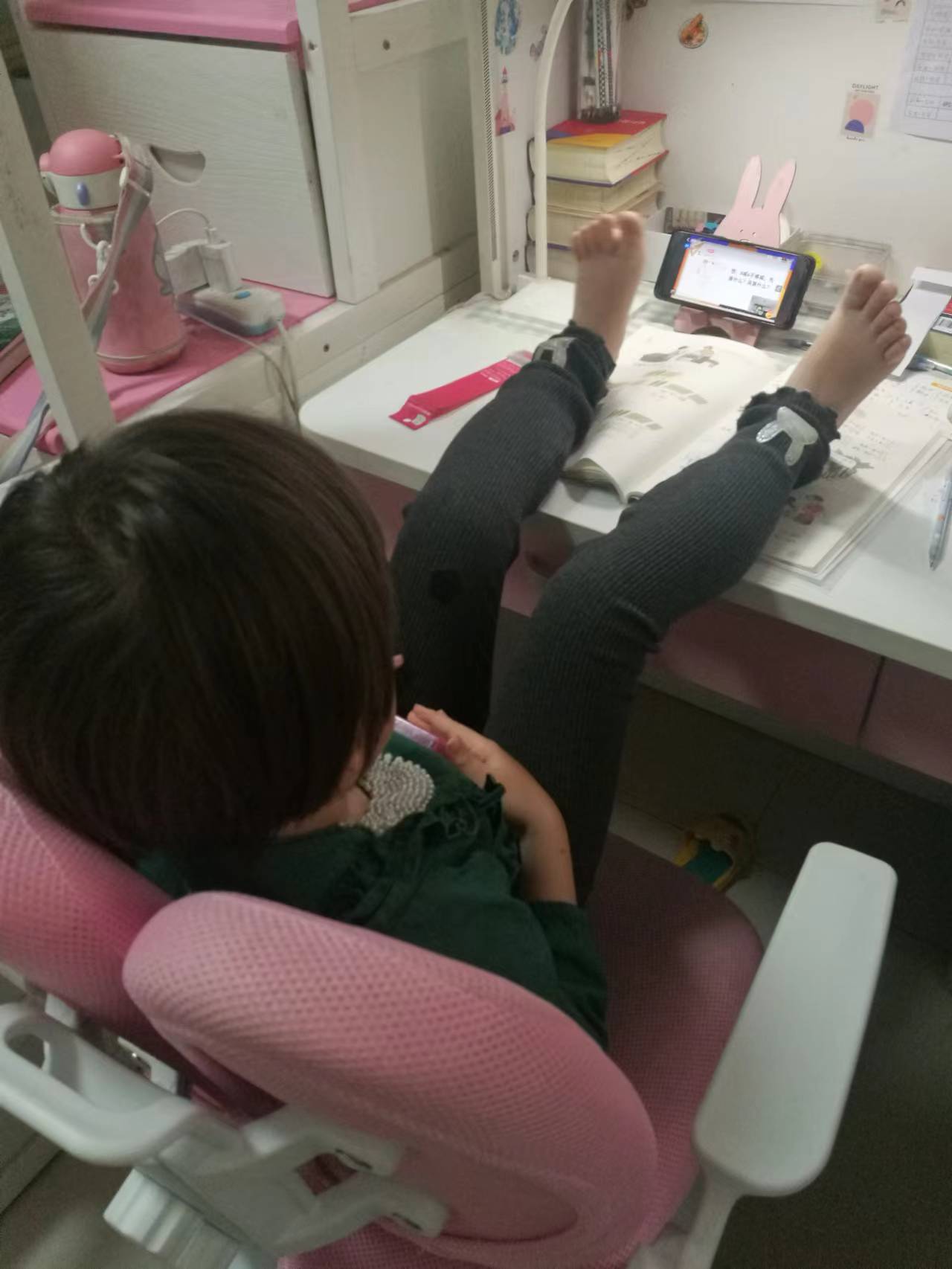 即使二宝是个乖巧的小孩,她的网课我也尽量陪着,提醒她、督促她,让她认真听讲,否则她也会分心,玩个橡皮,画个小画。